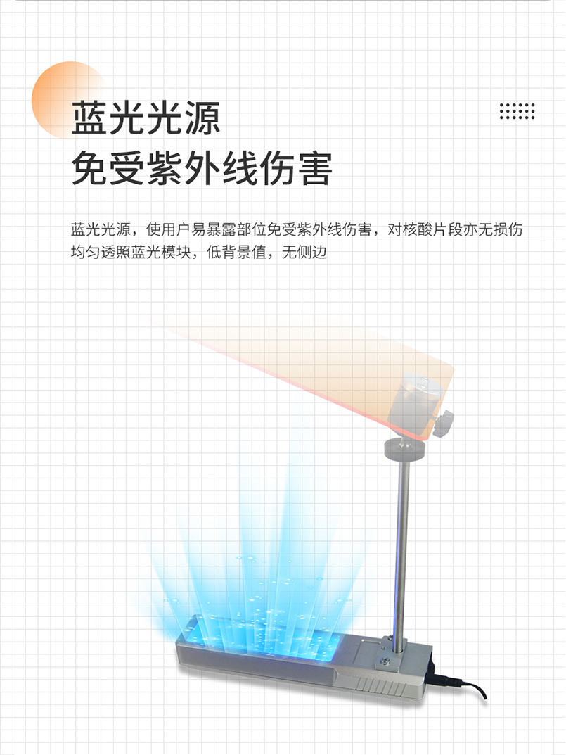产品描述:本仪器主要用途是用于临床和实验室进行电泳过程中观察含染料的核酸,只能由专业人士操作。需要搭配专用电泳仪使用。